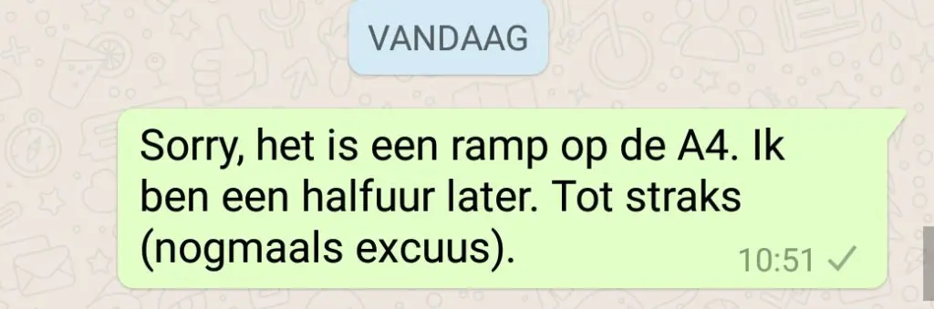 Dan kom ik te laat voor mijn volgende afspraak. Ik kijk op de achterbank van mijn auto en zie mijn tas staan. In die tas zit mijn telefoon, maar ik kan er niet bij. Bij het volgende benzinestation moet ik er even af om mijn telefoon te pakken om S. te appen dat ik te laat ben. De borden boven de weg geven 50 aan als adviessnelheid, maar mijn kilometerteller haalt nog geen 30. Ik reik mijn hand richting mijn tas, maar ook nu kan ik er niet bij. Het volgende benzinestation is nog niet in zicht. Mijn vorige afspraak met S. had ik ook al verplaatst, ik voel me bezwaard dat ik nu een halfuur te laat ben. Zeker als ik hem niet kan laten weten dat ik te laat ben. Hij komt vanuit Arnhem naar Amsterdam voor onze afspraak, ik wil hem niet laten wachten.