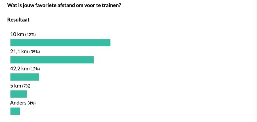 De 10 kilometer staat fier bovenaan, gevolgd door een halve marathon. De marathon blijkt populair bij een minderheid van 12% en voor een evenement van 5 kilometer zijn weinig lopers te porren.