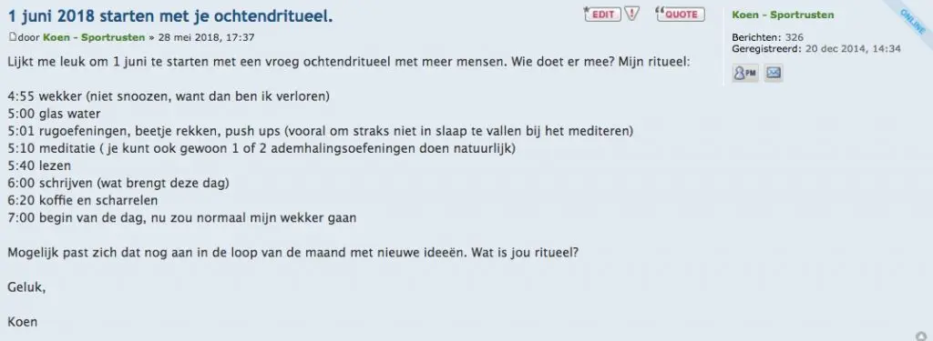 Ik doe het 5 dagen in de week om 04:45 gaat mijn wekker n om 22:30 stap ik in bed en heb nog energie om te sporten