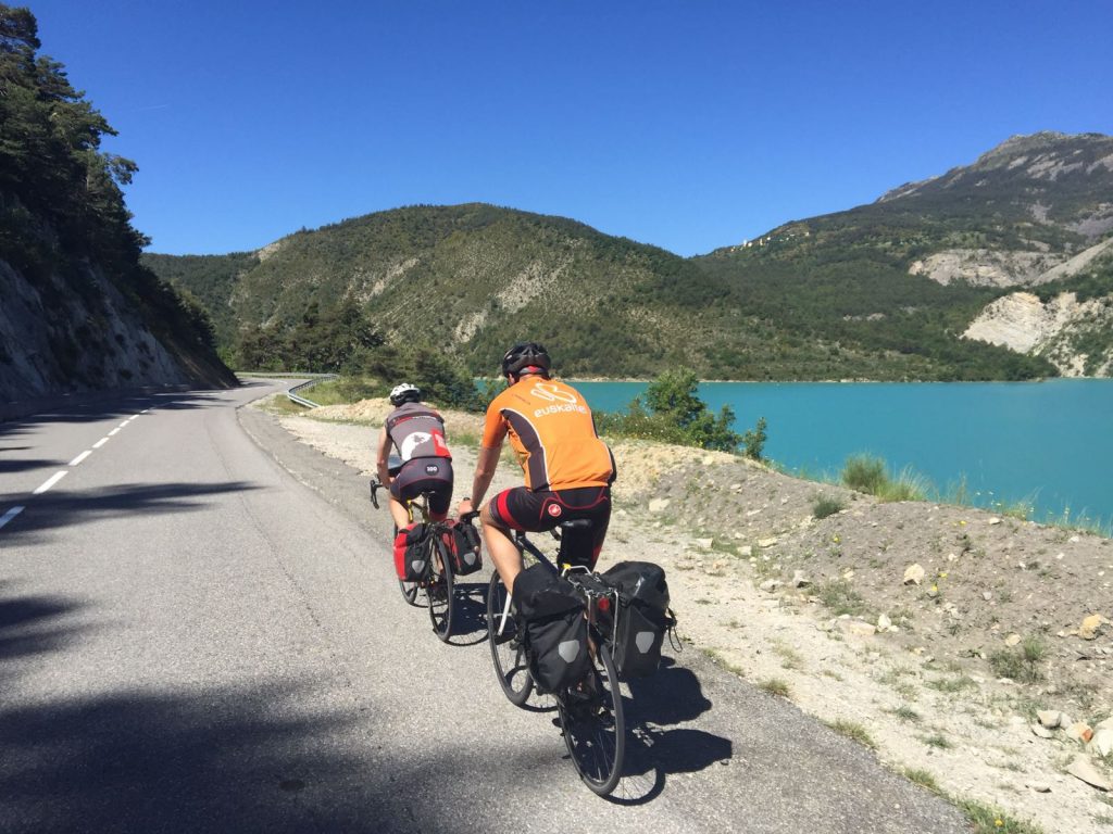 Nooit eerder liep ik met een fiets in mijn hand een berg op. Ik heb het gevoel dat ik iets doe wat niet hoort. Alsof ik met kleren aan op een naaktstrand loop. Maar na een kilometer krijg ik er weer lol in. De omgeving is prachtig en als ik boven ben daal ik af naar Guillestre.