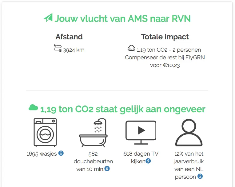 Via flygrn.com leer ik hoeveel CO2 we uitstoten met een retourtje naar Rovaniemi.