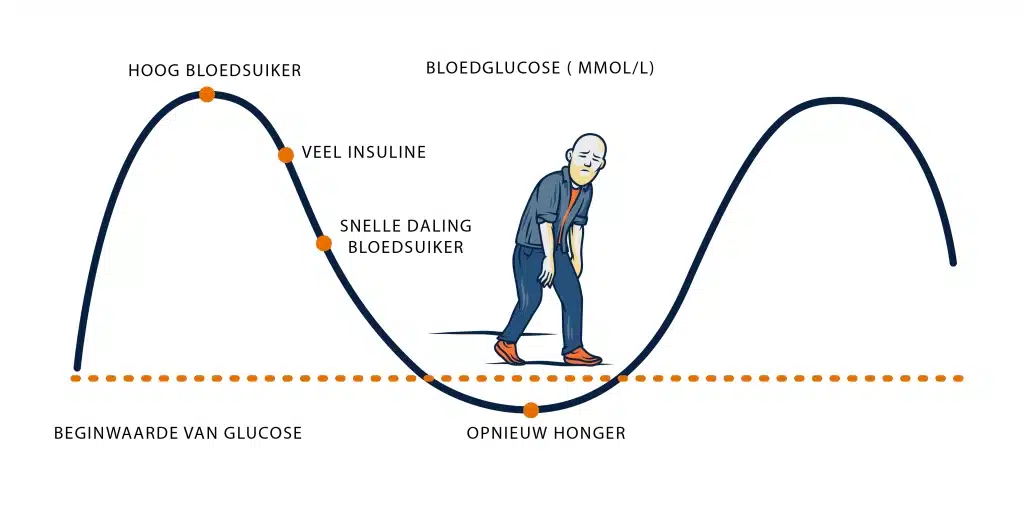 Na het eten stijgt je bloedsuikerspiegel. In reactie op deze hoge bloedsuikerspiegel maak je veel insuline aan en daalt je bloedsuikerspiegel weer. Het moment dat je bloedsuikerspiegel op een dieptepunt komt, heb je weer trek en ga je weer eten.