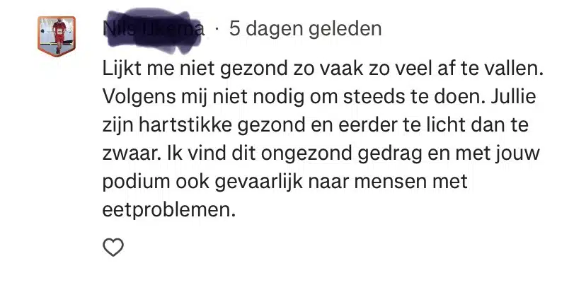 Tja, en dan dat afvallen, iets minder nadruk op het gewicht zou ik zelf wel passend vinden. Maar ook daar kunnen anderen weer net iets anders over denken.
