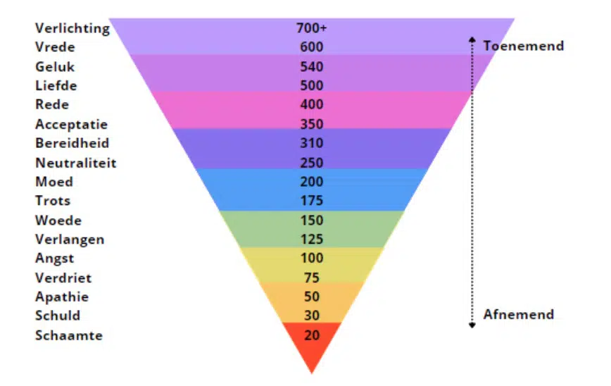 De Amerikaanse psychiater die er een model bij uitwerkte heet David R. Hawkins. Hij heeft meer dan 40 jaar onderzoek gedaan naar de effecten van emoties op het lichaam. De emoties heeft hij in kaart gebracht op 17 verschillende niveaus. Vanaf 200 Hz wordt het leuk in zijn schema.