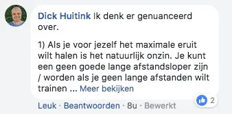 De genuanceerde reactie van Dick Huitink maakt helemaal duidelijk dat ik verwarring zaai en dat er twee trainingsvoorkeuren door elkaar worden gehaald. Want reken maar dat als je gericht met een hartslagmeter aan de bak gaat en op je marathonhartslag gaat trainen, je in de buurt van je PR komt. Dick zegt echter: