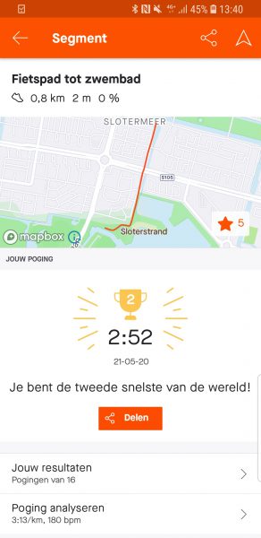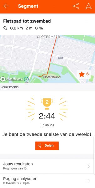 Maar er ligt wél een Strava-segment. Mijn snelste tijd op dat segment is 2:52″. Alleen Jurian Glas is sneller. Die ken ik niet. Maar op Strava zie ik dat hij die 800 meter in 2:51″ gelopen heeft.