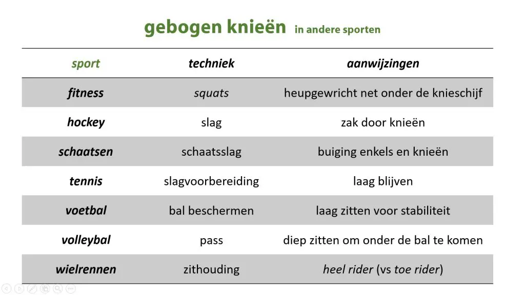 In bijvoorbeeld hockey, volleybal, tennis, wielrennen en fitness is veel aandacht voor technieken met gebogen knieën en rechtstandige bewegingen laag bij de grond.