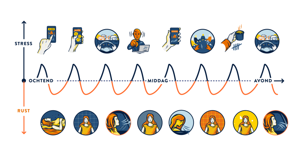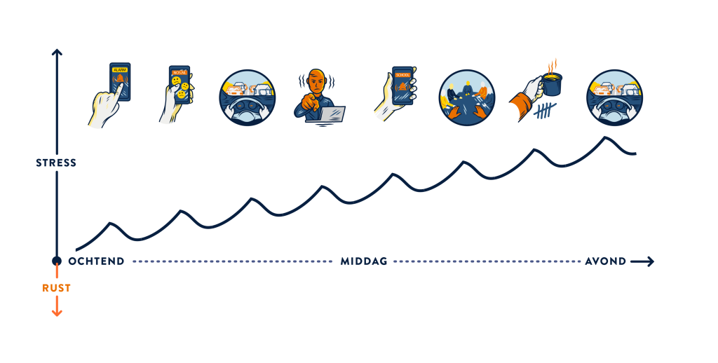 Hieronder zie je een stresscurve gedurende de dag. Wie op wilskracht, zonder ontspanning, de hele dag doordendert zit aan het eind van een dag hoog in de stress en dan is het moeilijk om te ontspannen.
