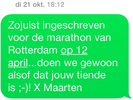 Steeds vaker krijgen wij ook vragen over dat malle schema van ons met maar 14K training voor de marathon. Vragen die ik niet kan beantwoorden. Althans niet uit eigen ervaring. Daarom besluit ik, twee dagen na mijn halve marathon in Amsterdam, om dit jaar de hele van Rotterdam te doen. Met dat gekke schema. Ik SMS mijn vader: