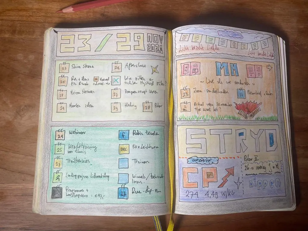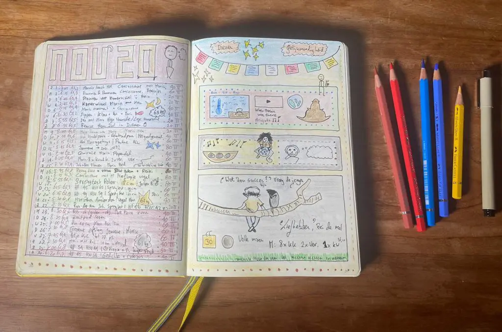 Daarin schrijf ik onder andere op hoelang ik mediteer, hoeveel ik sport en of ik die dag een leuke ontmoeting heb gehad waar ik dankbaar voor was. Met een dun pennetje (Micron PN) en een doos kleurpotloden, maak ik er wat van.