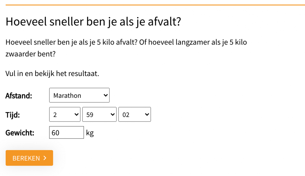 Volgens de calculator van Ron van Megen en Hans van Dijk scheelt dat nogal wat. Ik vul in dat ik 2:59:02 liep bij een gewicht van 60 kilo (59,8 kon ik niet invullen, er is niets achter de komma) en kijk wat eruit komt bij een gewicht van 58.
