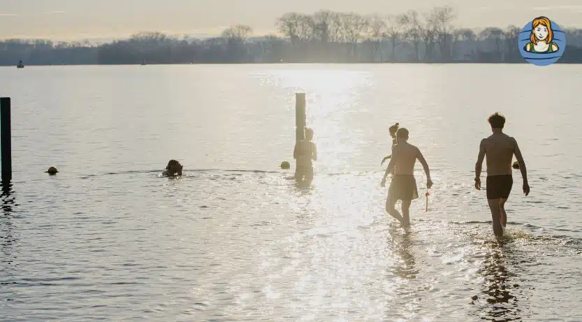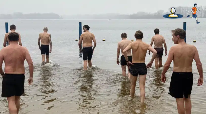 Halverwege: schoenen uit & dippen we 2 minuten in de Nieuwe Meer. Daarna rennen we terug naar het clubhuis.