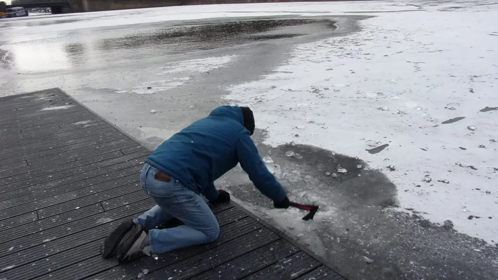 Ik ga op de vlonder zitten en stamp hard op het ijs. Er gebeurt niets.