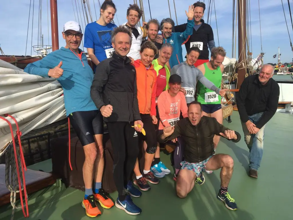 De helft van de mensen aan boord ging hardlopen, de andere helft ging aanmoedigen. Het was een gemêleerd gezelschap waarbij sommigen hun ei kwijt konden met zeilen en anderen beter waren met hardloopschoenen aan.