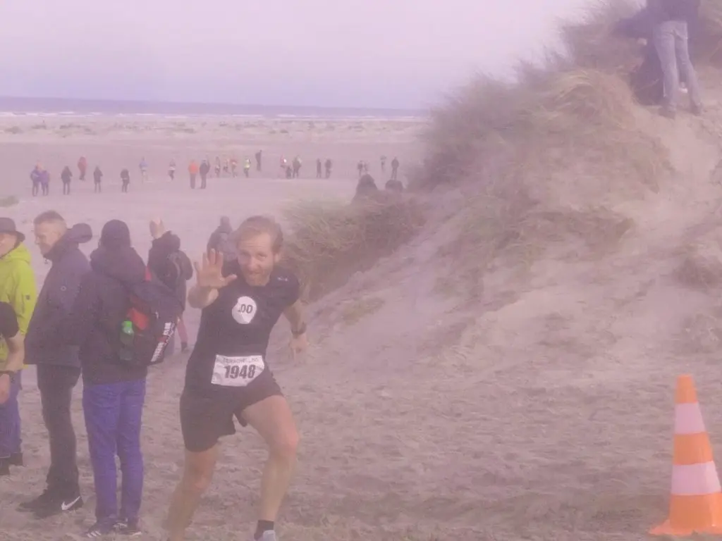Op het strand (dik 2 kilometer) hielden we niet in en van het strand af stond een club bekenden ons aan te moedigen.